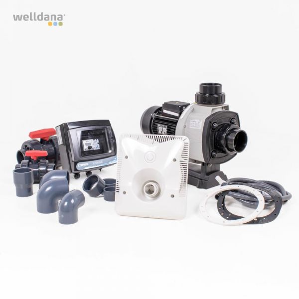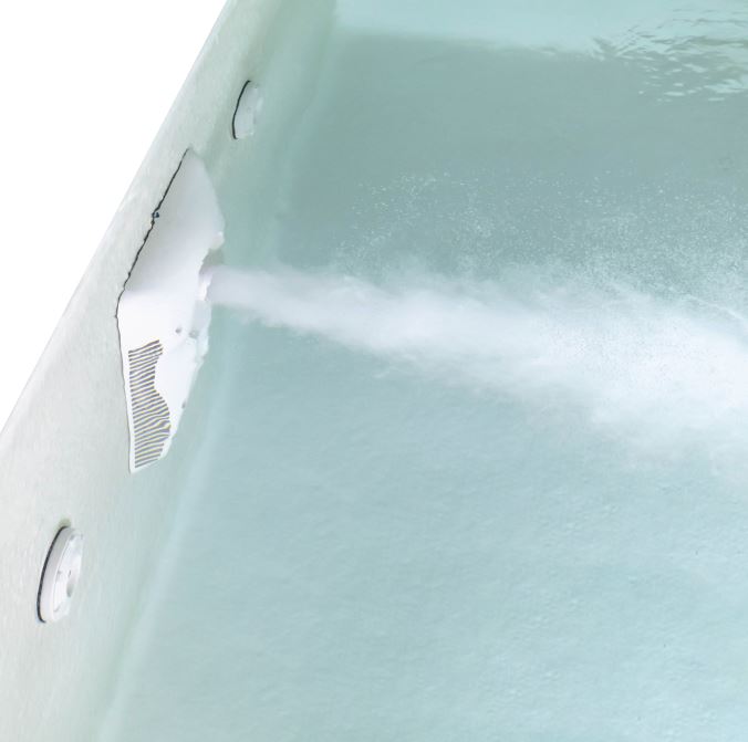 Egentlig er det simpelt! Svømmetræneren monteres i den ene ende af poolen. Den suger vand ind af suget og sender det ud gennem dysen øverst. Du kan justere trykket i modstrømmen, ved at åbne for et lille luftindtag. Her blandes luft i vandet og trykket øges hermed. De store anlæg til elitesvømmeren fungerer lidt anderledes, men princippet er det samme.